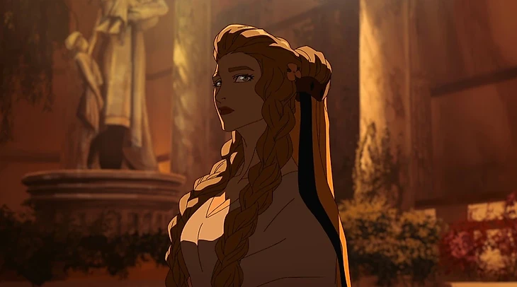 Гера – главная героиня, богиня брака и королева Олимпа. Она является сестрой таких известных богов, как Гестия, Деметра, Аид и Посейдон, а также женой Зевса. Гера выделяется красотой и высоким ростом, а ее яркие голубые глаза привлекают внимание. Богиня предпочитает носить пастельно-фиолетовое платье, которое подчеркивает статус, с глубоким V-образным вырезом и золотым декором, что добавляет величественности.