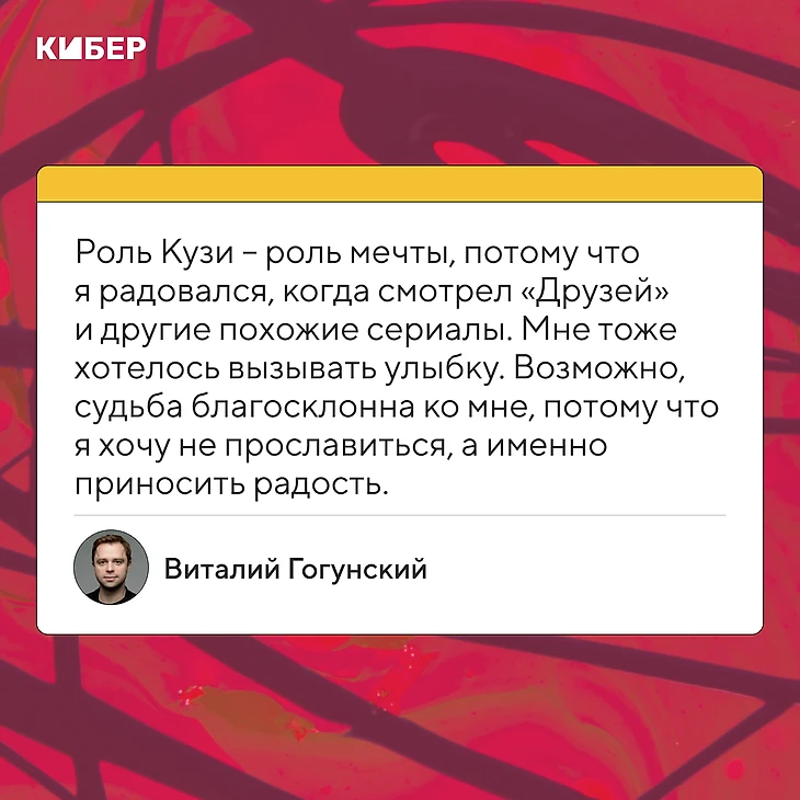– Наверное, я на своем месте и, как ты правильно заметил в начале, просто хочу приносить людям счастье. Роль Кузи – тоже роль мечты, потому что я радовался, когда смотрел «Друзей» и другие похожие сериалы. Мне тоже хотелось вызывать улыбку. Возможно, судьба благосклонна ко мне, потому что я хочу не прославиться, а именно приносить радость. Как говорил Владимир Семенович Высоцкий: «Верные книжки ты в детстве читал». Я правильно выбрал предназначение и мечты. Потому что неправильные мечты не сбываются.