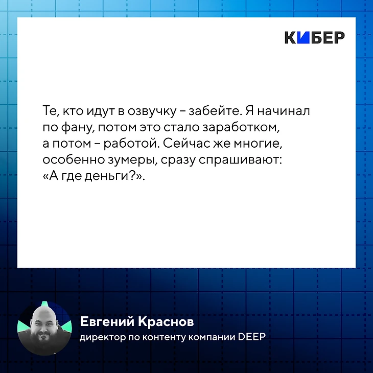 – Те, кто идут в озвучку – забейте. Я начинал по фану, потом это стало заработком, а потом – работой. Сейчас же многие, особенно зумеры, сразу спрашивают: «А где деньги?». Я не знаю ни одного, кто хотел бы озвучивать просто так, без оплаты. Потому что сейчас деньги важны. Люди быстрее взрослеют и понимают, что им нужно на что-то жить.