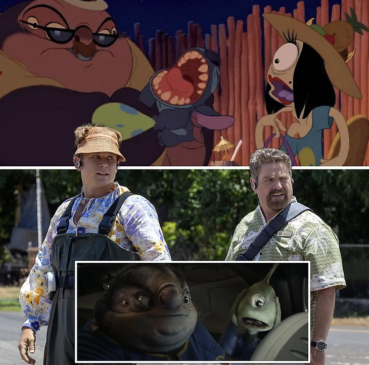 Некоторых связующих сцен больше нет – взамен добавили еще больше Стича. Например, по прибытии на Землю героя не сразу сбивает машина. В этот раз он угнал гольф-кар и на всех парах влетел в чей-то свадебный шатер: искупался в шампанском, уничтожил торт, атаковал жениха. Вставка ради вставки. Дополнение ради дополнения. Все ради мемов и новых тиктоков.