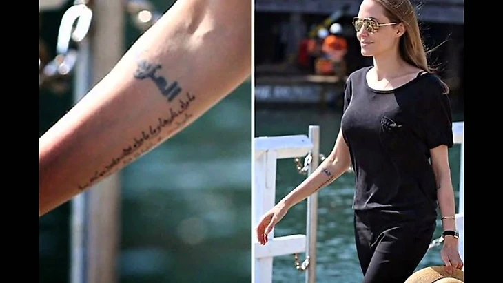 На правом предплечье у актрисы арабская вязь – надпись, означающая в переводе «решимость» или «силу духа». Когда она была замужем за Билли Бобом Торнтоном,, супруг придумал определенный геометрический символ, который Джоли нанесла на предплечье. Но после развода символ исчез и появилась надпись.