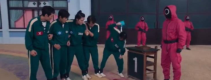 В пятом испытании «Игра в небесного кальмара» участники должны пройти три раунда: на каждой из трех огромных башен сбросить в пропасть минимум одного человека. Кихун предусмотрительно привязал ребенка к себе.