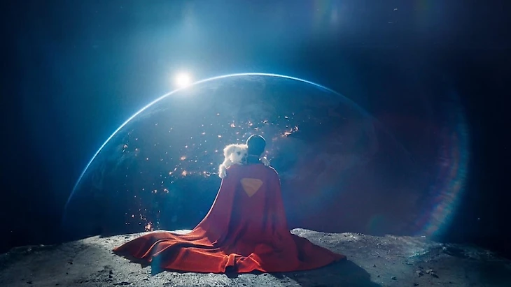 Первая сцена – трогательный кадр, где Супермен и его верный друг Крипто сидят на Луне и смотрят на Землю. Этот тихий и почти поэтический эпизод подчеркивает связь героя и его питомца, а также символизирует размышления о том, что для героя значит дом и ответственность перед ним.