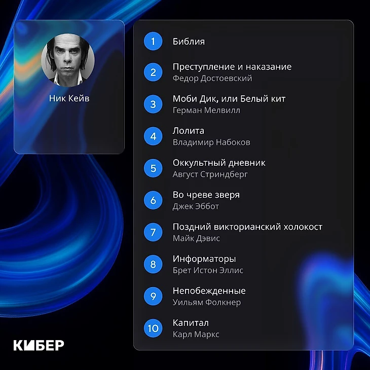Ник Кейв о «Преступлении и наказании» Федора Достоевского: «Преступление и наказание» произвело на меня потрясающее впечатление. Мы проходили этот роман в школе благодаря замечательному учителю литературы, который вдохновил меня глубоко погрузиться в этот литературный океан. Эта книга действительно изменила меня, она сильно повлияла на мое представление о том, как можно жить вне рамок чужих ожиданий. Раскольников сделал это по-своему. Для меня, австралийца, была особенно близка мысль, что можно жить наперекор другим, тем, кто с детства тебе внушал: «Заткнись, не высовывайся и не суетись».