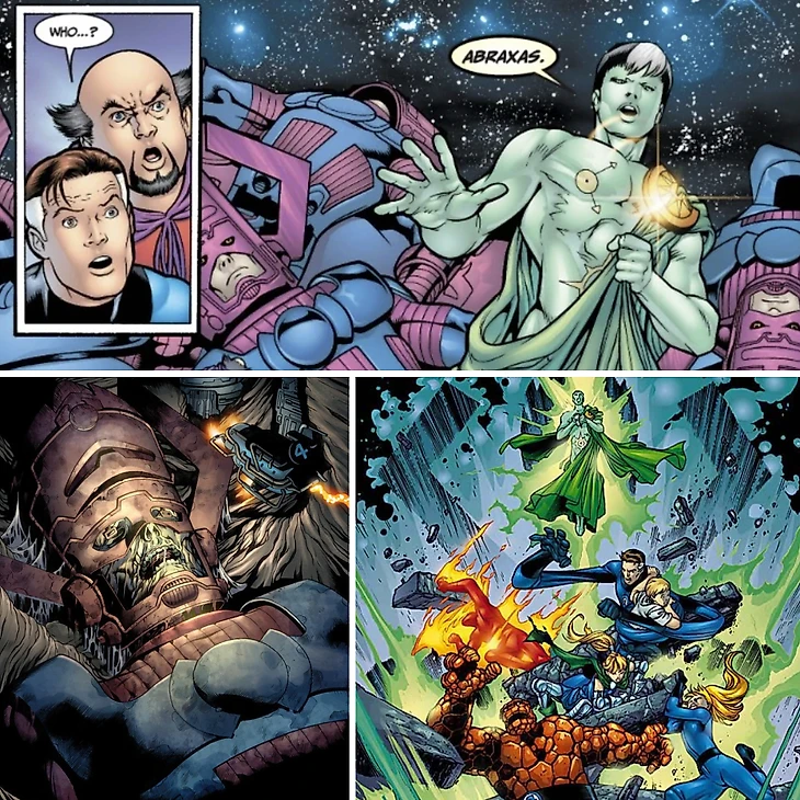 В итоге ученого перенесло в новорожденную седьмую мультивселенную (текущая временная линия Marvel) в облике могущественного Галактуса. Теперь он служит универсальной константой, существом чистой энтропии. Он ни злой, ни добрый. Галактус – точка опоры для тонкой балансировки вселенной, чья смерть приводит либо к катастрофическому взрыву, либо к освобождению еще более мощного злодея (хотя куда уж!) по имени Абраксас – злого аналога Вечности и разрушителя вселенных.