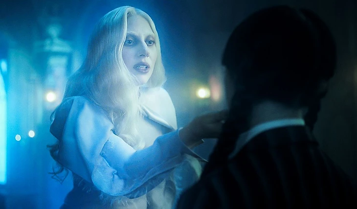 Леди Гага появилась в шестом эпизоде под названием «Горе тебе» и исполнила роль Розалины Ротвуд – призрака легендарной преподавательницы академии Невермор, обладавшей мощными психическими способностями.