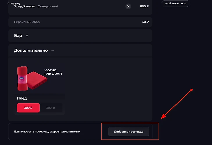 3. Затем укажите желаемые места в зале и перейдите к оформлению заказа.