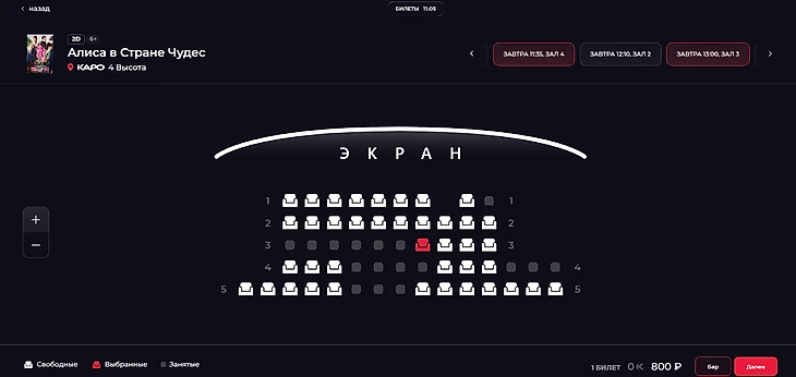 2. Выберите интересующий фильм, кинотеатр, дату и время сеанса.