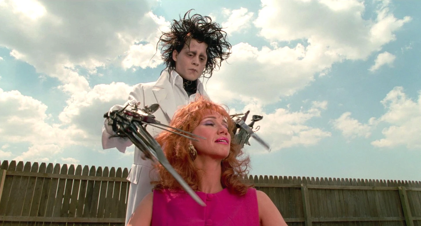 Депп сыграл в картине главную роль – искусственно созданного человека, у которого вместо рук ножницы. Эдвард не чудовище, а робкий, чувствительный юноша, который живет в особняке таинственного изобретателя. История начинается после смерти создателя, когда продавщица косметики Пэг Боггс находит героя на полуразрушенной усадьбе и привозит в свой дом. Вначале Эдвард – удивительная диковинка, к которой все проявляют интерес и даже заботу, но вскоре его инаковость становится проблемой.