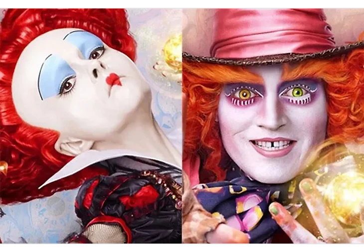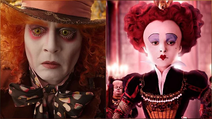 «Алиса в Стране чудес» (Alice in Wonderland, 2010). Депп играет Чеширно-безумного Шляпника, а Бонем Картер – капризную Красную (Червонную) королеву с непропорционально огромной головой. Их персонажи редко пересекаются романтически, но визуально создают тот самый фирменный «буртоновский» дуэт.