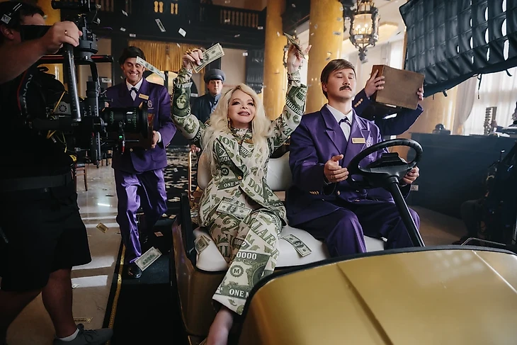 В кадре Долина исполняет песню «За деньги да» – хит Инстасамки, который в контексте происходящих вокруг артистки событий приобрел почти сатирическое звучание. Во время выступления на зрителей сыплются фальшивые долларовые купюры, а визуальные детали номера явно намекают на тему финансов, власти и ироничного самоосмысления образа.