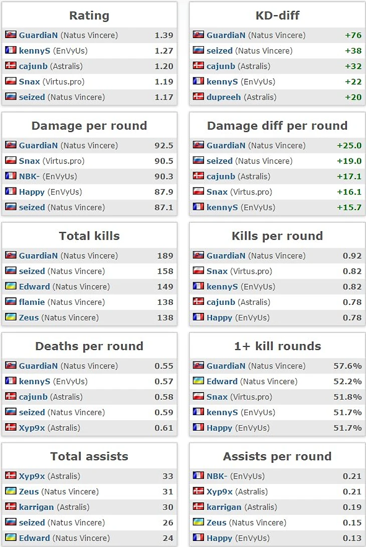Согласно статистике портала HLTV, словацкий игрок занял первое место в 12 категориях. Среди них «Рейтинг», «Разница по убийствам и смертям», «Общее количество убийств» и «Общее количество убийств из AWP».