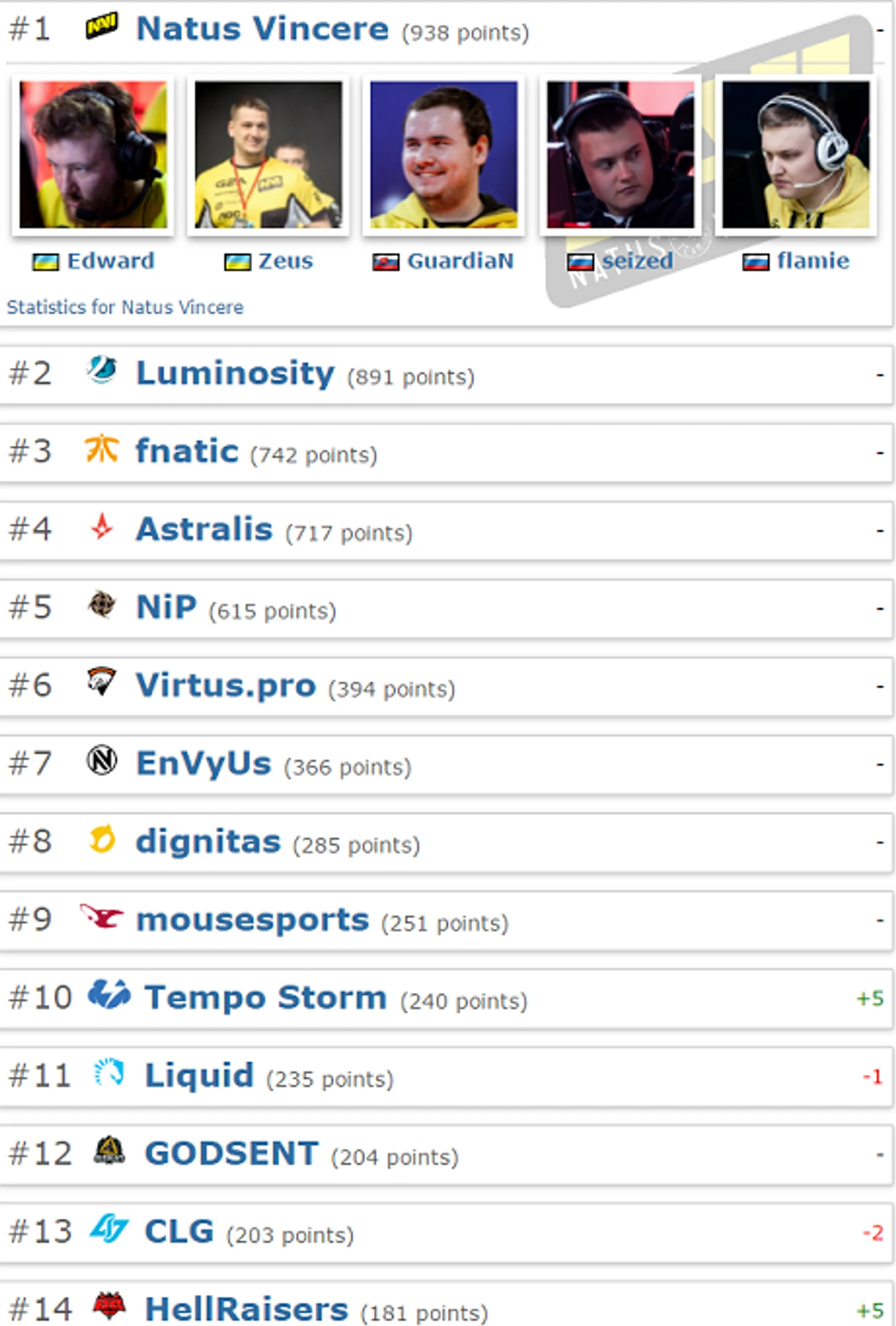Пятерка лидеров в виде Na’Vi, Luminosity, Fnatic, Astralis и Ninjas in Pyjamas осталась не измененной.