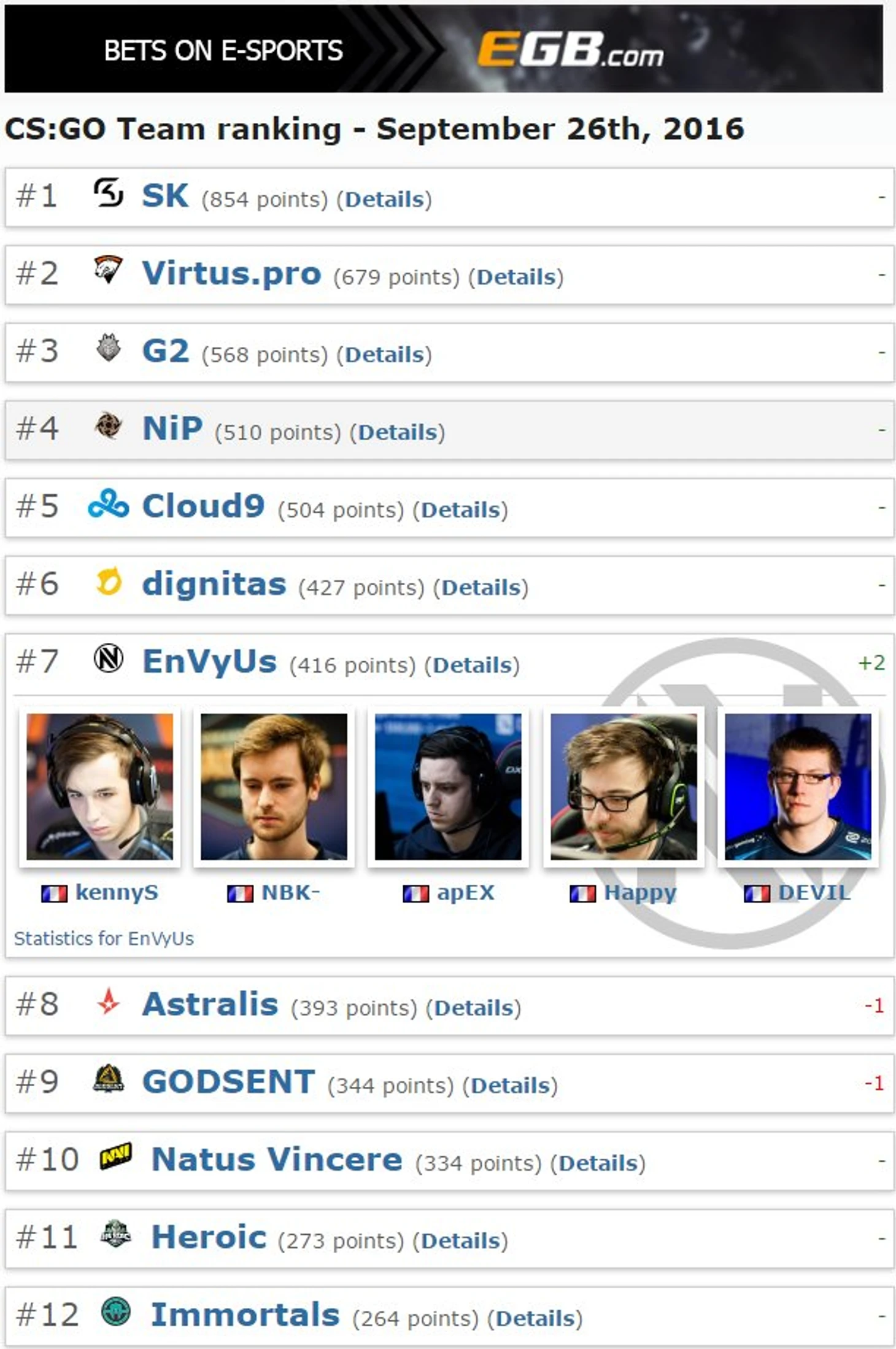 Французы из EnVyUs после победы на Gfinity CS:GO Invitational сумели подняться на 2 позиции вверх и теперь занимают 7 строчку, сместив Astralis и GODSENT на 8 и 9 место соответственно. Замыкают десятку сильнейших Natus Vincere.