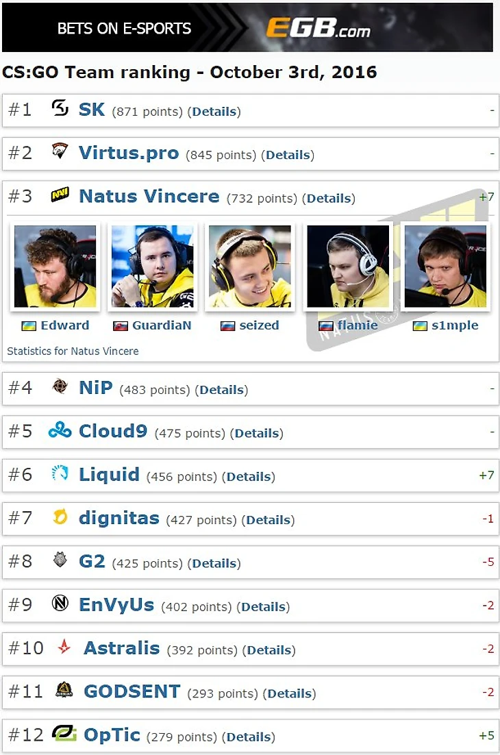 Первое и второе места остались без изменений: их занимают SK Gaming и Virtus.Pro, однако польская пятерка значительно сократила разрыв. На третье место попал чемпион ESL One Natus Vincere, поднявшись на 7 позиций и сместив G2, которая опустилась на 8 место.