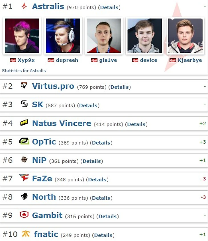 В первой тройке изменений не произошло: лидирует Astralis, следом идут Virtus.pro и SK Gaming.