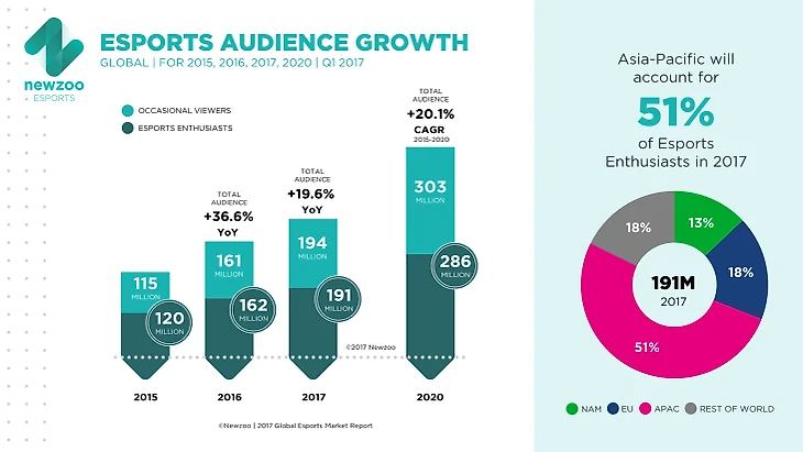 Аудитория в 2017 году вырастет на 19.6% по сравнению с 2016 годом и составит 191 миллион человек. По прогнозам, в 2020 году количество зрителей киберспортивных трансляций составит 303 миллиона.
