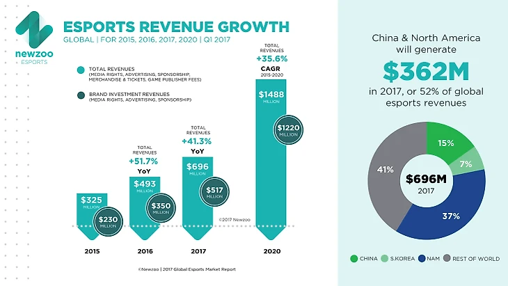По данным прибыль киберспорта в 2017 году составит 696 миллионов долларов, при этом 52.1% придется на Китай и Америку. К 2020 году прибыль вырастет до 1.5 миллиардов.