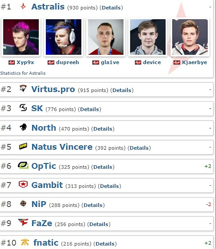 Таблица изменилась незначительно: лидирует Astralis, Virtus.pro на втором месте, SK Gaming замыкает тройку сильнейших. Четвертую строчку сохранил коллектив North, за ними по прежнему идет Natus Vincere.