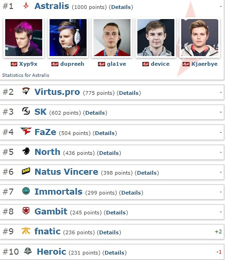 Изменения в первой десятке произошли только в нижней части рейтинга: fnatic вернулась топ-10, поднявшись на две позиции и расположившись на 9 месте, а на 10 месте оказался коллектив Heroic.