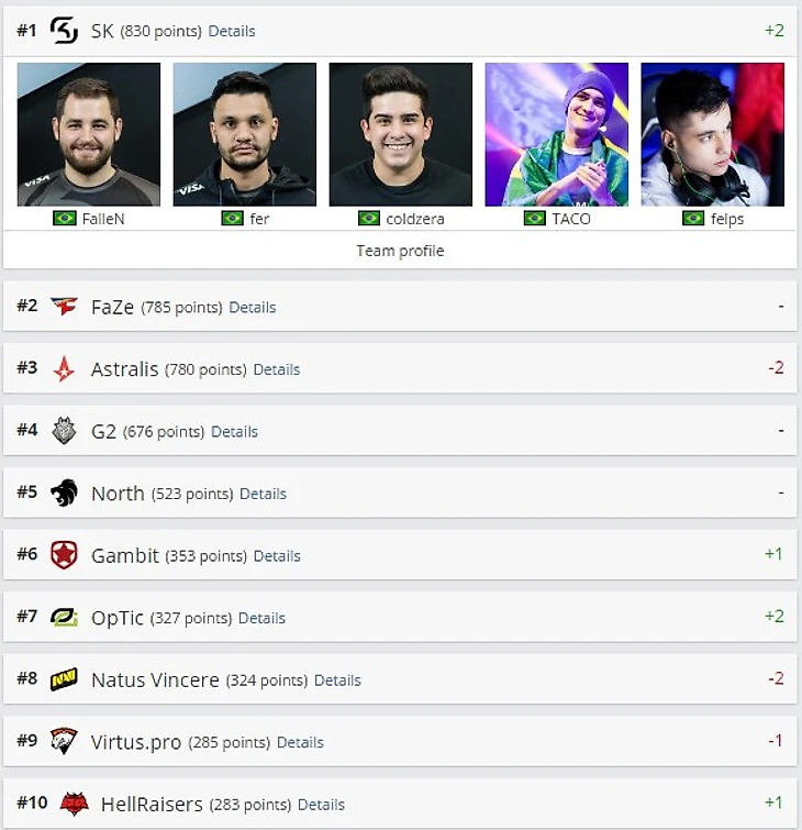 Бразильский коллектив SK Gaming занял первую строчку, обойдя FaZe Clan и Astralis, которые занимают 2-е и 3-е место соответственно.