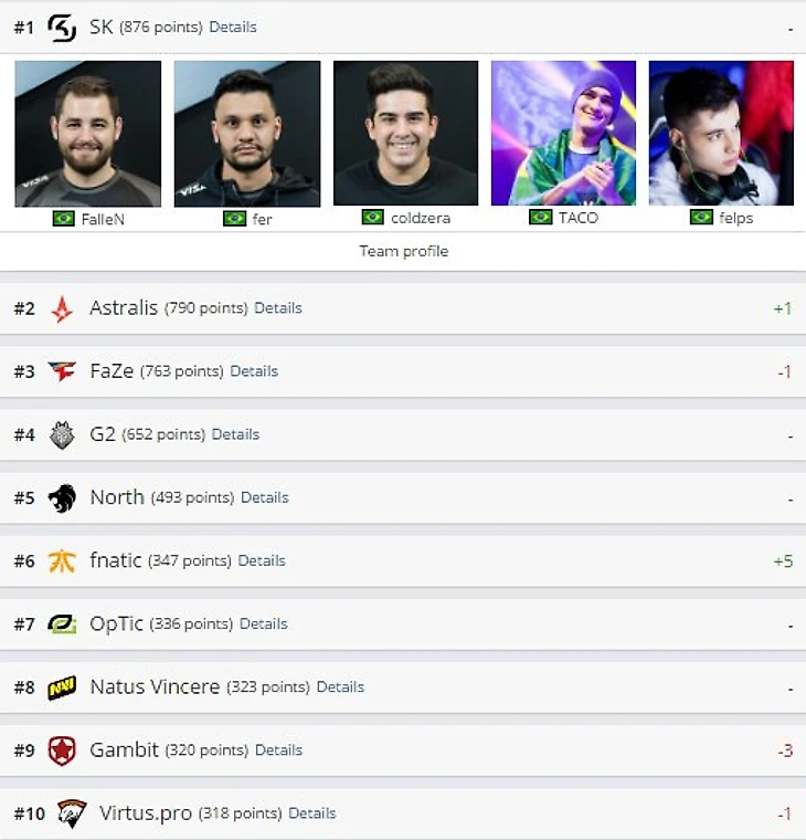 Лидерство сохранил бразильский коллектив SK Gaming, а на вторую строчку поднялась датская команда Astralis.