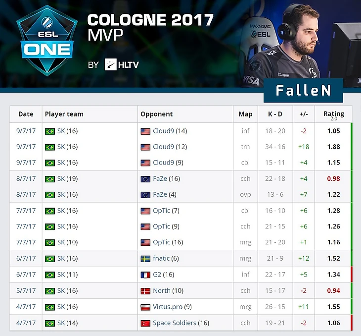 Игрок SK Gaming Габриэль «Fallen» Толедо был признан лучшим игроком ESL One Cologne по версии портала HLTV.org.