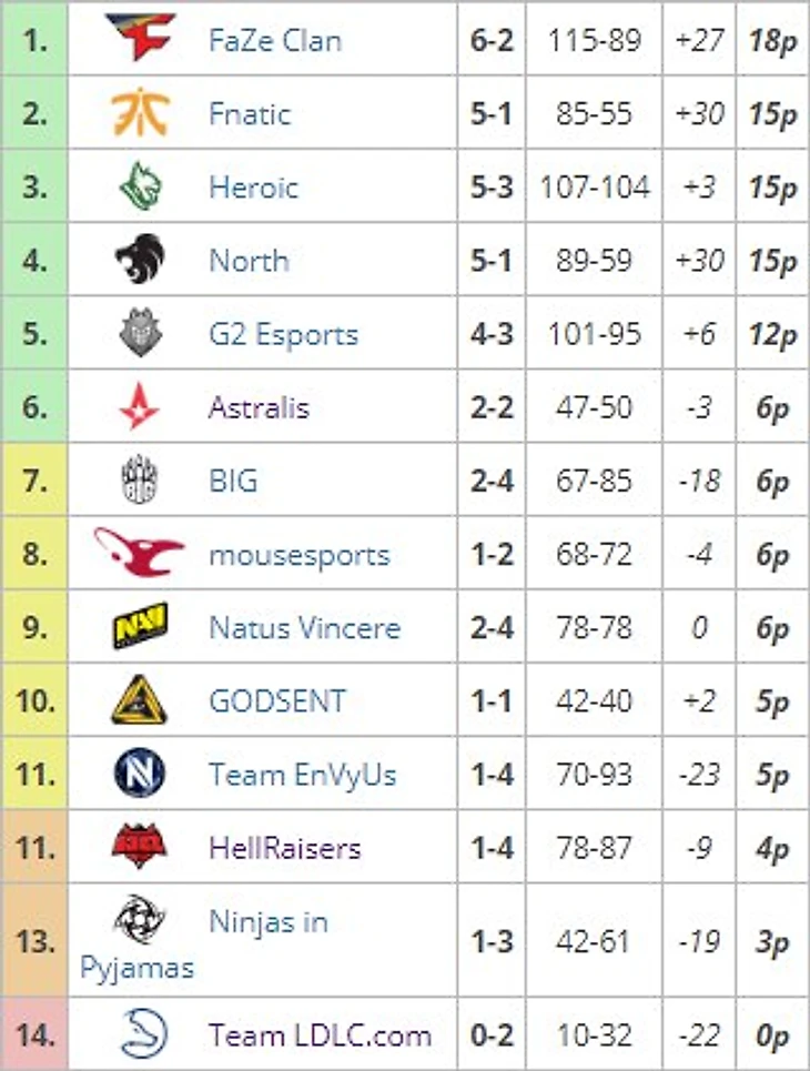 В европейском дивизионе лидирует FaZe Clan, выигравшая 6 карт из 8. Heroic (5-3) и Fnatic (5-1) идут в топ-3. В североамериканском дивизионе лидирует SK Gaming (6-2), в тройке – OpTiC (4-0) и Team Liquid (4-2).