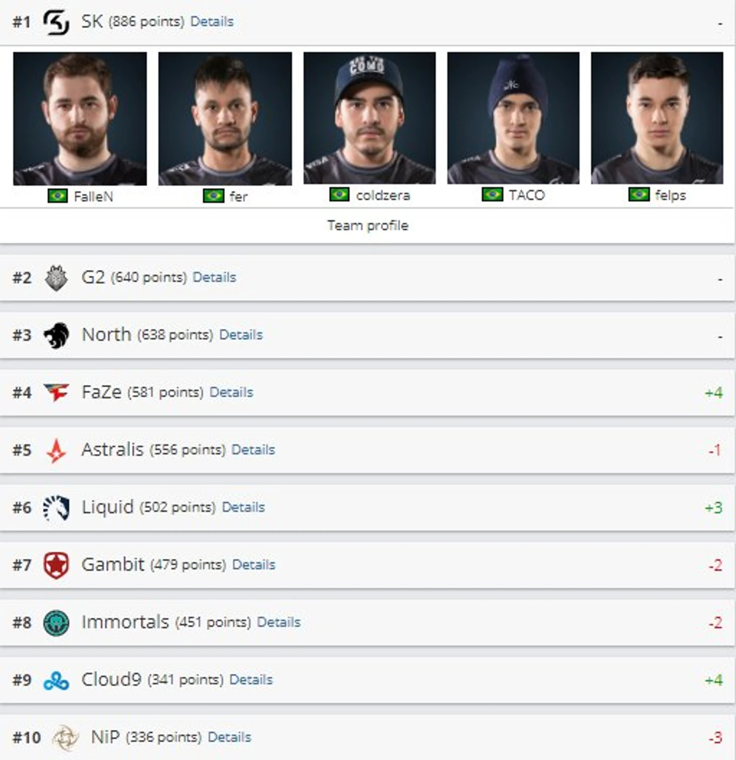Тройка лидеров осталась без изменений: на первой строчке SK Gaming, следом идут G2 Esports и North. На четвертую строчку поднялась команда FaZe Clan, одержавшая в Нью-Йорке победу, сместив тем самым датчан из Astralis на пятую позицию.