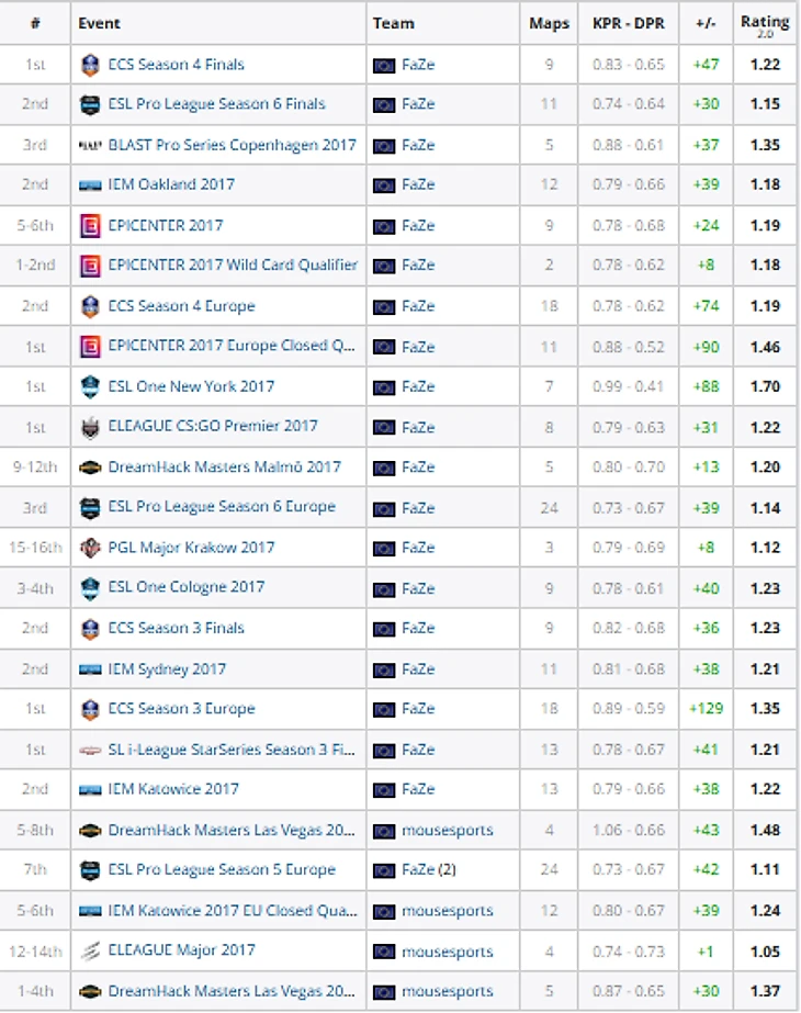 Игрок FaZe Clan Никола «NiKo» Ковач сыграл с положительным рейтингом на всех турнирах в 2017 году, на которых принимал участие.