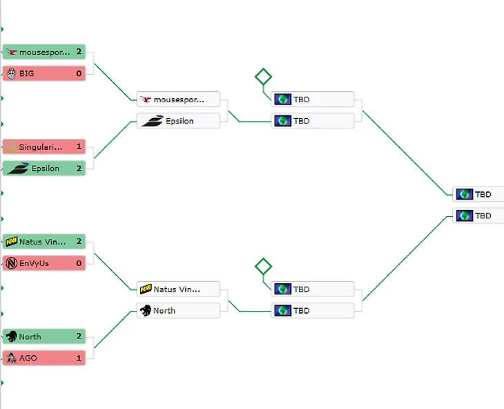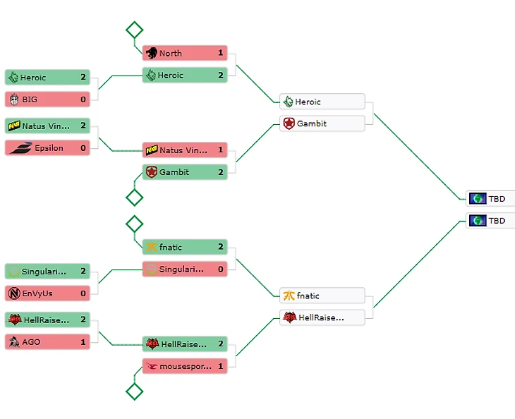 15:00 Fnatic 2-0 Hellraisers15:00 Heroic 2-0 Gambit18:00 Mousesports 2-1 Epsilon18:00 Natus Vincere 1-2 North21:20 Gambit 2-1 mousesports22:20 North 2-1 Hellraisers