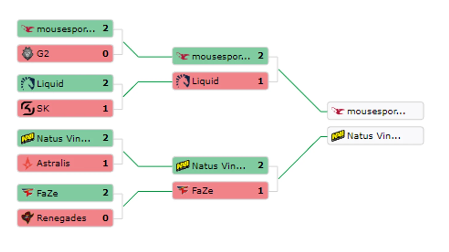 11:00 Team Liquid 2:1 SK Gaming14:00 Faze Clan 2:0 Renegades17:00 G2 0:2 Mousesports20:00 Natus Vincere 2:1 Astralis
