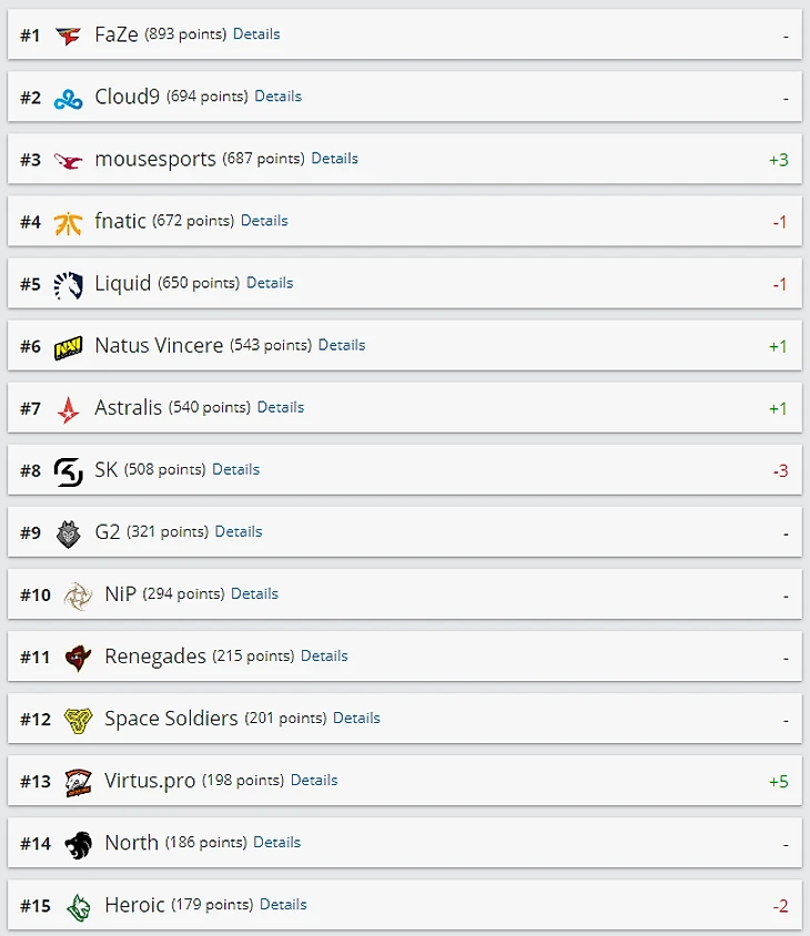 Победа на V4 Future Sports Festival позволила Mousesports впервые в истории подняться на третье место. Virtus.pro, занявшая второе место на турнире, также укрепилась в рейтинге. Теперь команда занимает 13-ое место. Также в рейтинге поднялись Tyloo и Spirit, сыгравшие в финале StarLadder Invitational Chongqin. Сейчас команды занимают 20-е и 25-е место соответственно.