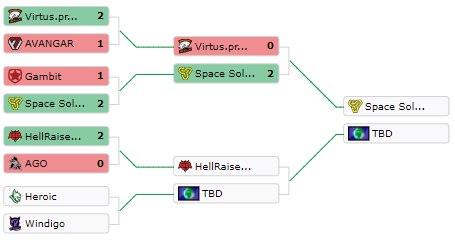 16:00 Virtus.pro 2-1 Avangar19:00 Gambit 1-2 Space Soldiers22:00 Hellraisers 2-0 AGO