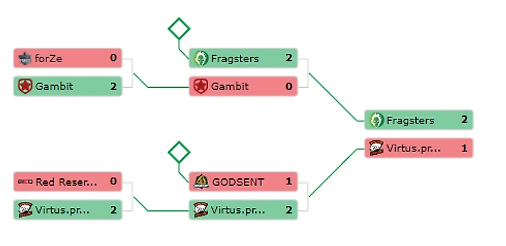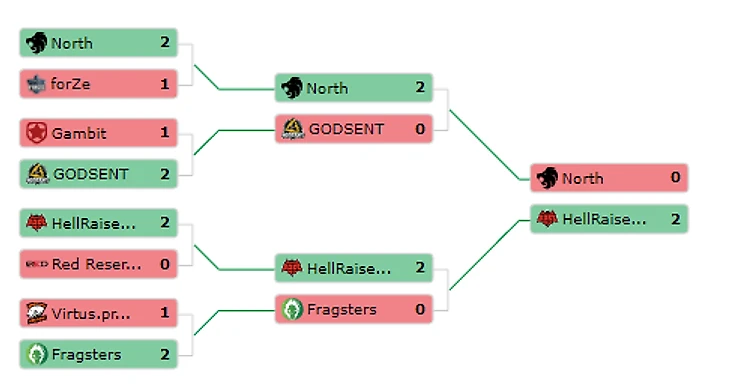 10:00 Forze 0-2 Gambit13:00 Red Reserve 0-2 Virtus.pro16:00 North 2-0 Godsent19:00 Hellraisers 2-0 Fragsters