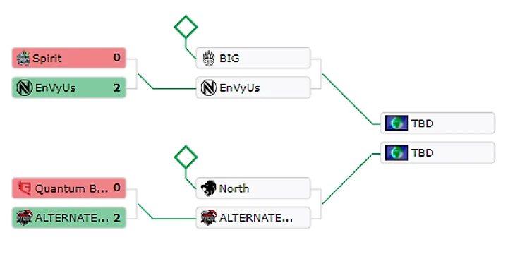 13:00 North 2-0 Spirit13:00 QBFire 0-2 BIG13:00 Envyus 1-2 Space Soldiers13:00 Alternate Attax 0-2 Gambit16:00 North 0-2 Space Soldiers16:00 BIG 1-2 Gambit19:00 Alternate Attax 2-0 QBFire19:00 Spirit 0-2 Envyus