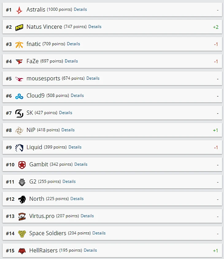 Natus Vincere поднялись на две строчки и теперь занимают второе место. NiP также укрепили свои позиции в рейтинге. Сейчас шведская команда занимает восьмое место. Попадание на LAN-финал ESL Pro League позволило Hellraisers подняться на одну позицию. Теперь команда Кирилла «ANGE1» Карасева находится на 15-ом месте. Godsent поднялась на 17-ое место благодаря победе на Qi Invitational.