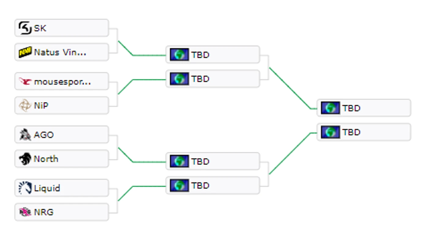 10:00 Team Liquid 1-2 NRG13:00 AGO 1-2 North16:00 NiP 1-2 Mousesports19:00 SK Gaming 1-2 Na’Vi