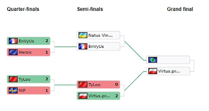 06:00 Virtus.pro 2-0 Tyloo / Полуфинал08:30 Natus Vincere 2-0 Team Envyus / Полуфинал13:00 Virtus.pro 1-2 Natus Vincere / Гранд-финал