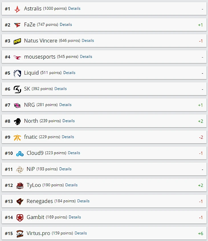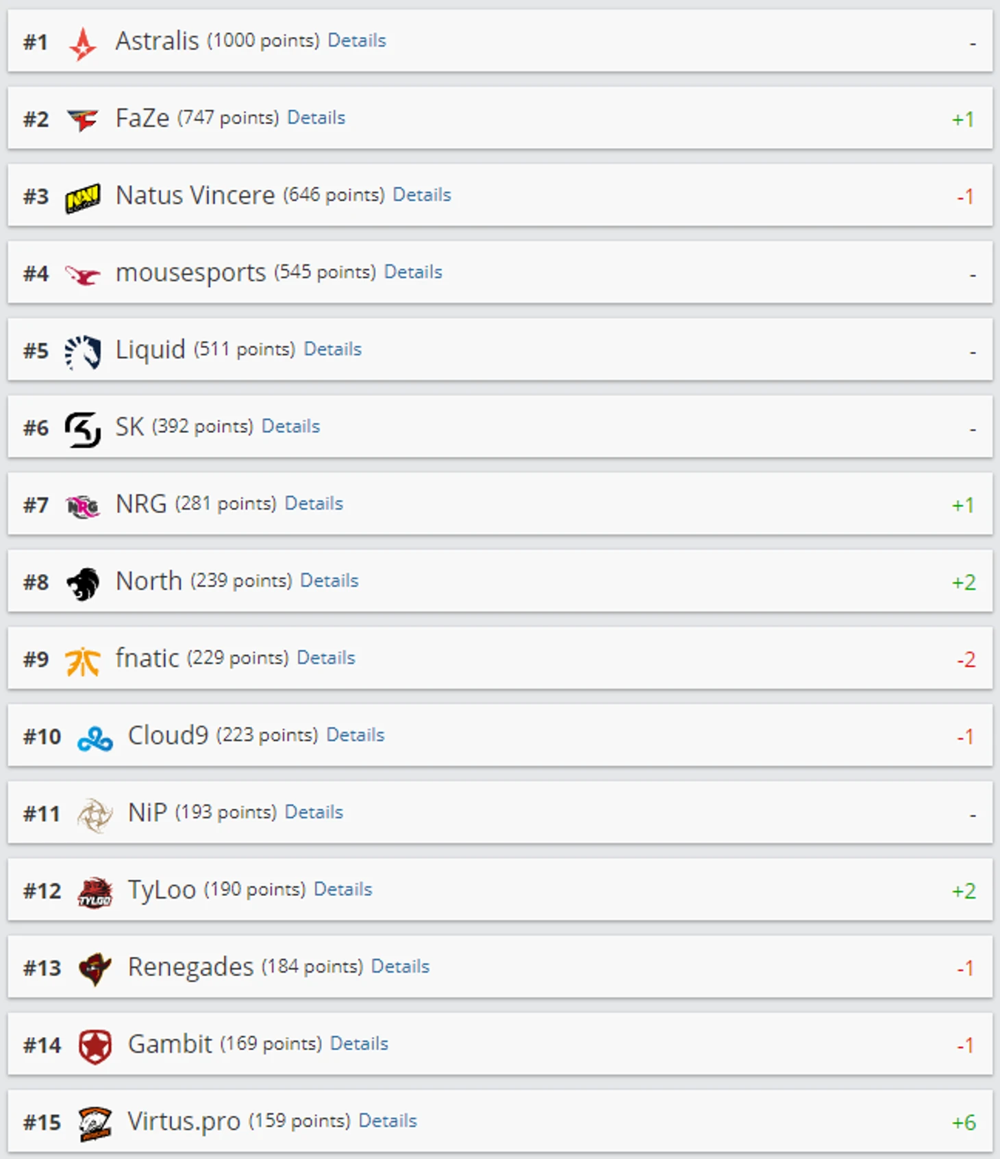 Faze Clan поднялась на второе место благодаря победе на ESL One Belo Horizonte. North забралась на восьмое место, а NRG – на седьмое. Virtus.pro, дошедшая до финала CS:GO Asia Championships, поднялась на шесть строчек и теперь находится на 15-й позиции. На 13 строчек рейтинга взлетела Imperial, занявшая первое место на DreamHack Summer. Теперь команда находится на 24-м месте.