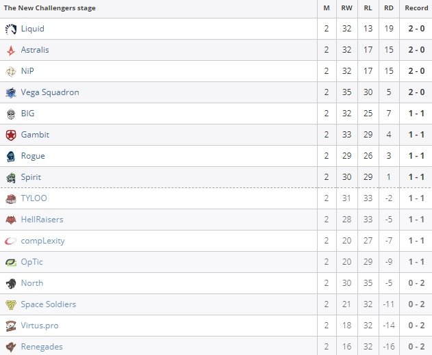 12:00 Astralis 16:4 Complexity13:30 NiP 16:12 Tyloo15:00 BIG 16:19 Vega Squadron16:30 Team Liquid 16:9 Hellraisers18:00 Rogue 13:16 Astralis19:30 Renegades 10:16 Gambit21:00 North 13:16 Team Spirit22:30 Optic Gaming 16:13 Virtus.pro00:00 Space Soldiers 11:16 Complexity