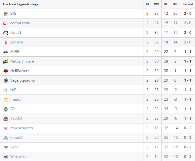 12:00 Vega Squadron 14:16 Fnatic13:30 Tyloo 10:16 Hellraisers15:00 Winstrike 16:19 Cloud916:30 Complexity 16:8 BIG18:00 Na’Vi 16:6 NiP19:30 G2 4:16 MIBR21:00 Astralis 15:19 Team Liquid22:30 Faze Clan 16:8 Mousesports