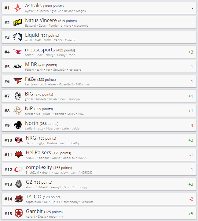 Победа Mousesports на ESL One New York позволила ей подняться на четвертую строчку. На одну позицию в рейтинге поднялись BIG и NiP. Теперь они занимают седьмое и восьмое место соответственно. Gambit взлетела на пять строчек и сейчас находится на 15-м месте. Space Soldiers поднялась на 17 позиций благодаря неплохому выступлению на BLAST Pro Series. Турецкая команде теперь занимает 22-е место.