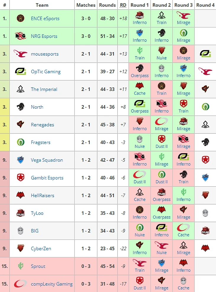 10:00 Renegades 16:12 Imperial11:30 Fragsters 16:12 North13:00 Optic Gaming 16:14 Mousesports14:30 Cyberzen 3:16 Hellraisers16:00 Tyloo 10:16 BIG17:30 Vega Squadron 16:9 Gambit19:00 BIG 19:17 Mousesports20:30 Imperial 11:16 North22:00 Vega Squadron 16:7 Hellraisers