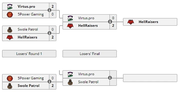 10:00 Virtus.pro 0-2 Swole Patrol / Финал нижней сетки Wild Card13:00 Faze Clan 2-1 Ence /Матч группы А16:00 Natus Vincere 2-1 Hellraisers / Матч группы А20:00 Hellraisers 2-1 Ence / Матч на вылет в группе А