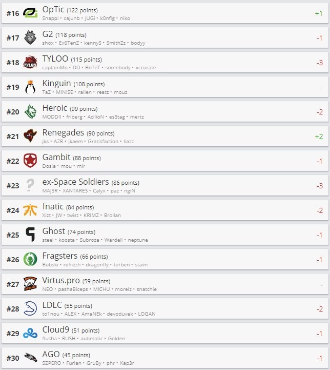 North опустилась с 7-го места на 10-е, Tyloo – с 15-го на 18-е, а Fnatic – с 22-го на 24-е.
