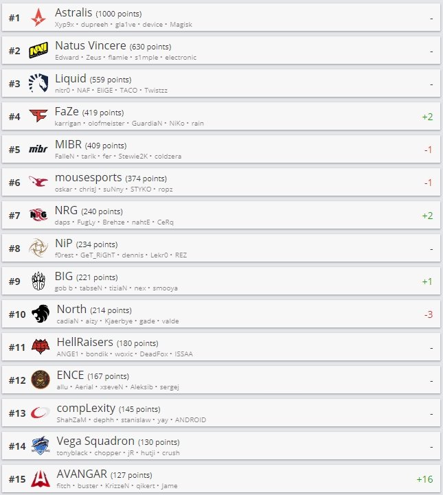 Avangar, занявшая 3-4-е место на EPICENTER 2018, преодолела 16 позиций и теперь располагается на 15-й строчке. Faze Clan, выигравшая турнир в Москве, поднялась с 6-го места на 4-е. NRG и Renegades поднялись на две позиции и теперь находятся на 7-м и 21-м месте соответственно.