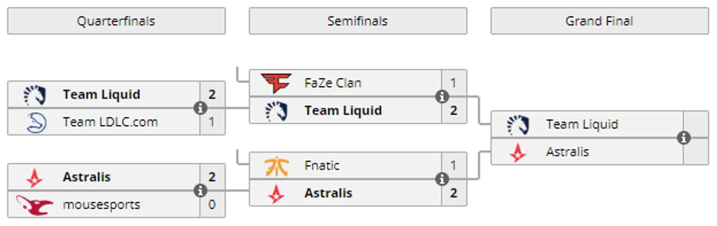 21:00 Team Liquid 2-1 LDLC / Четвертьфинал00:35 Astralis 2-0 Mousesports / Четвертьфинал