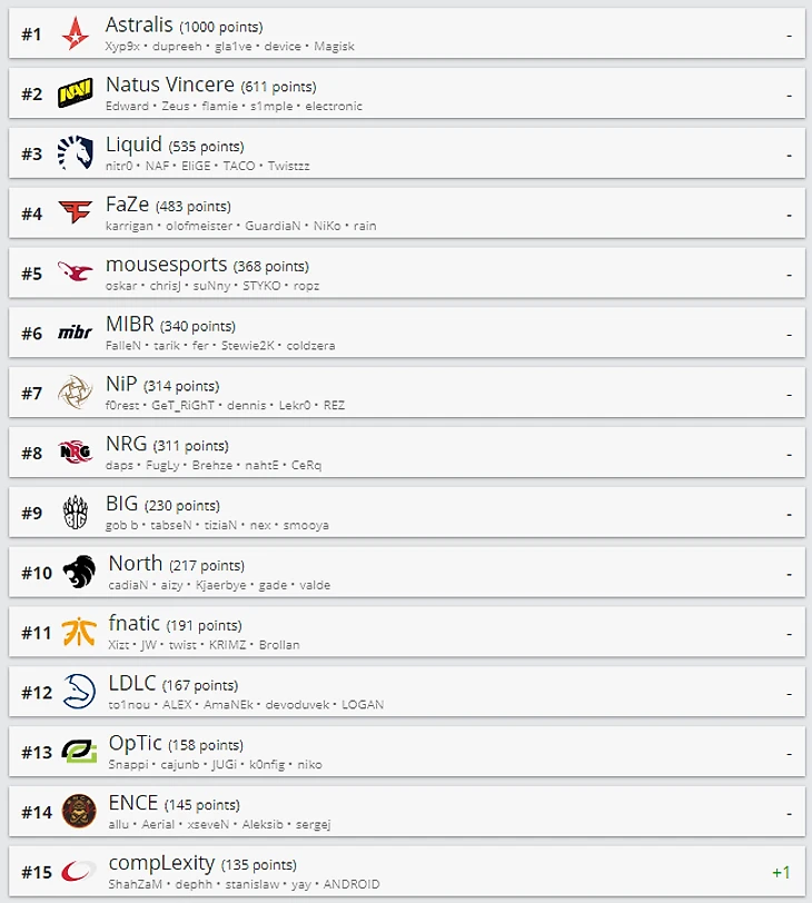 Hellraisers упали на 16-е место, а Vega Squadron – на 20-е. Несмотря на успешное попадание на СНГ-майнор, Gambit опустилась на 25-ю строчку. Tyloo также продолжила терять позиции в рейтинге. Сейчас китайская команда находится на 29-м месте.