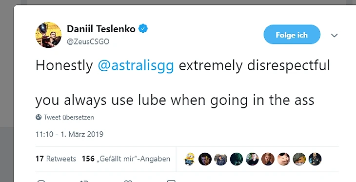 «Astralis, ну что за неуважение. Хоть бы смазку использовали», – написал игрок в твиттере. Позже он удалил запись.